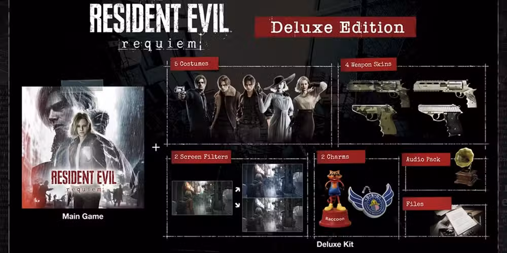 Si estás dispuesto a pagar un poco más de Réquiem del mal residenteCon un precio de $69.99, la Edición Deluxe de $79.99 te otorgará una variedad de recompensas cosméticas por tus problemas además del juego base. Ofreciendo 5 disfraces de personajes únicos, 4 diseños de armas, 2 filtros de juego, 2 amuletos, un paquete de audio y lo que parecen ser archivos basados ​​en la historia, todo RéquiemEl contenido de la Edición Deluxe es el siguiente: