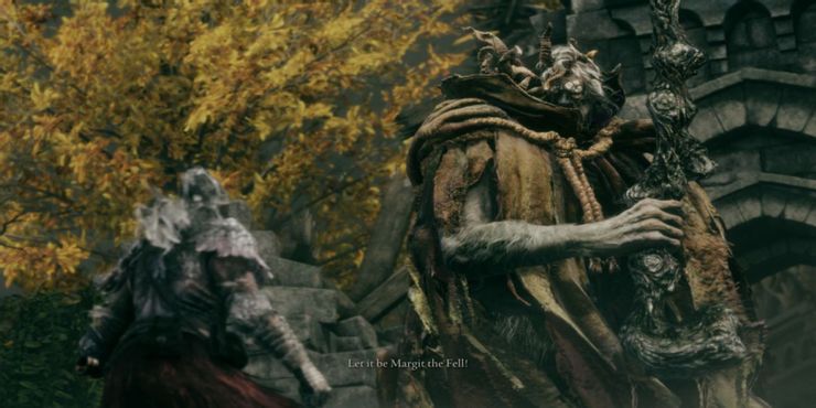 “Margit The Fell”, el jefe principal que los jugadores encontraron en el Anillo de Elden Network Test, es una figura severa y salvaje devastada por innumerables mutaciones: parches de pelaje, una corona de cuernos que brota de su cabeza y una cola gruesa y carnosa. Margit bloquea el camino que conduce al Castillo Stormveil, una enorme mazmorra llena de bestias salvajes y monstruosidades de múltiples extremidades, lo que llevó a muchos Anillo de Elden jugadores a pensar que su apariencia grotesca provino de los experimentos de “injerto” realizados por el igualmente deformado y retorcido Anillo de Elden Jefe “Godrick El Dorado”. Sin embargo, una publicación reciente en Anillo Elden’La cuenta de Twitter de s mostró una imagen de Margit junto con este pie de foto: “Las marcas de maldición que llevaba desde su nacimiento fueron otra señal siniestra para la familia real”.