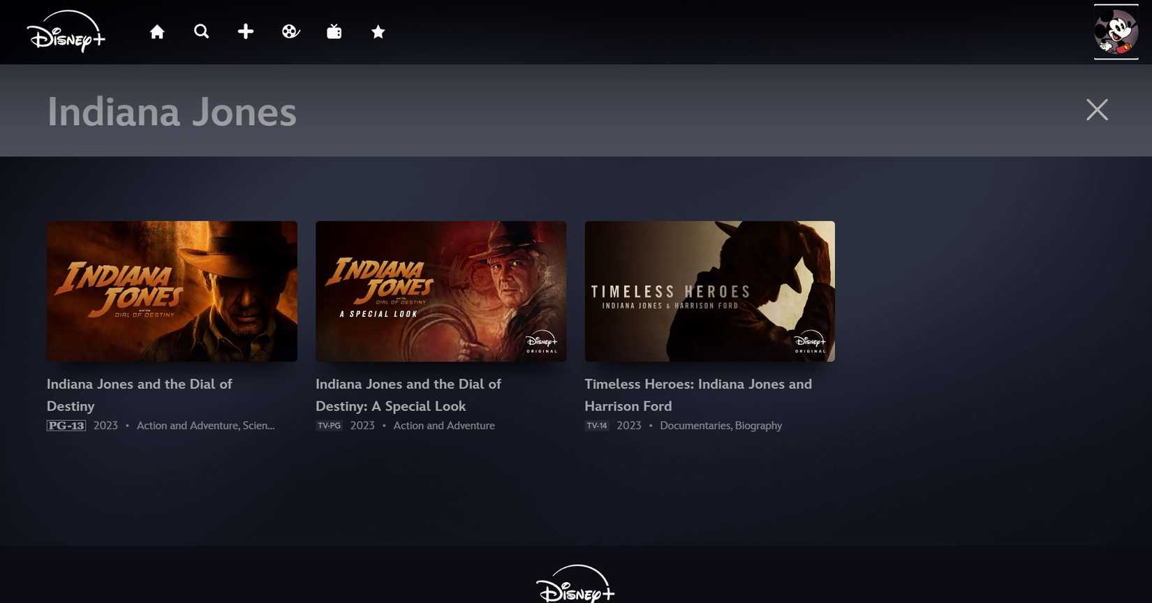 Disney+ ya ha sido eliminado En busca del arca perdida, Indiana Jones y el templo maldito (1984), Indiana Jones y la última cruzada (1989), y Indiana Jones y el reino de la calavera de cristal mundial. Al momento de escribir este artículo, Disney no ha abordado la eliminación de las películas. Vea una captura de pantalla a través de What’s On Disney Plus a continuación del contenido actualmente disponible cuando se usa “Indiana Jones” como término de búsqueda, que incluye Indiana Jones y el dial del destino y dos especiales: