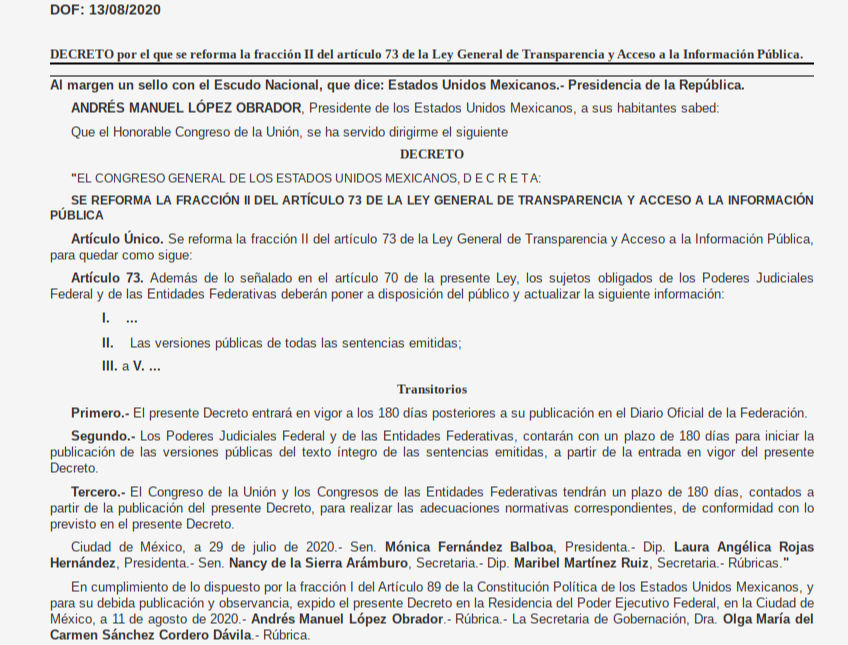 Un decreto publicado este jueves en el Diario Oficial de la Federación (DOF) hace obligatoria la publicación de las versiones públicas de las sentencias emitidas por jueces de todo el país, en un plazo no mayor a los seis meses.