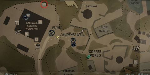De vuelta en Coffee World, pasa Pozo Huotari y Expreso expreso alcanzar Taller de los Caballeros de Kalevala. Gira a la derecha frente a la entrada del Taller, luego encuentra la lonchera cerca de un cobertizo con algunas rocas pintadas. |