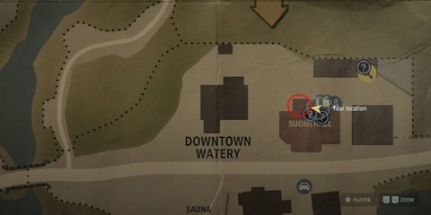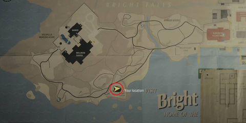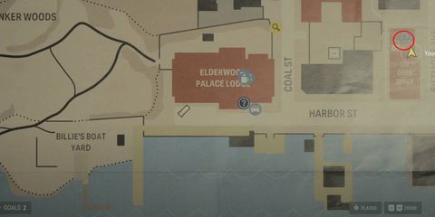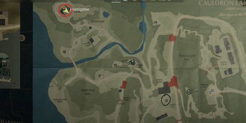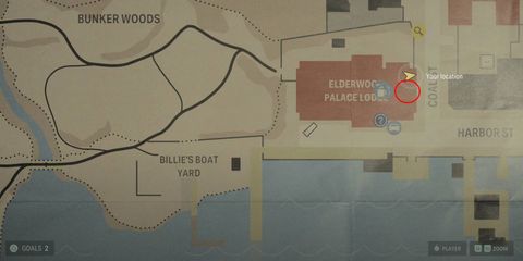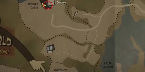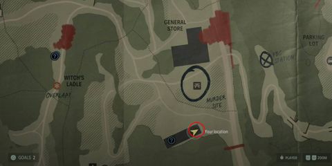 Ir sur del Sitio del asesinatodonde puedes encontrar Deer Head en una cabaña de madera directamente debajo de la Tienda General. |