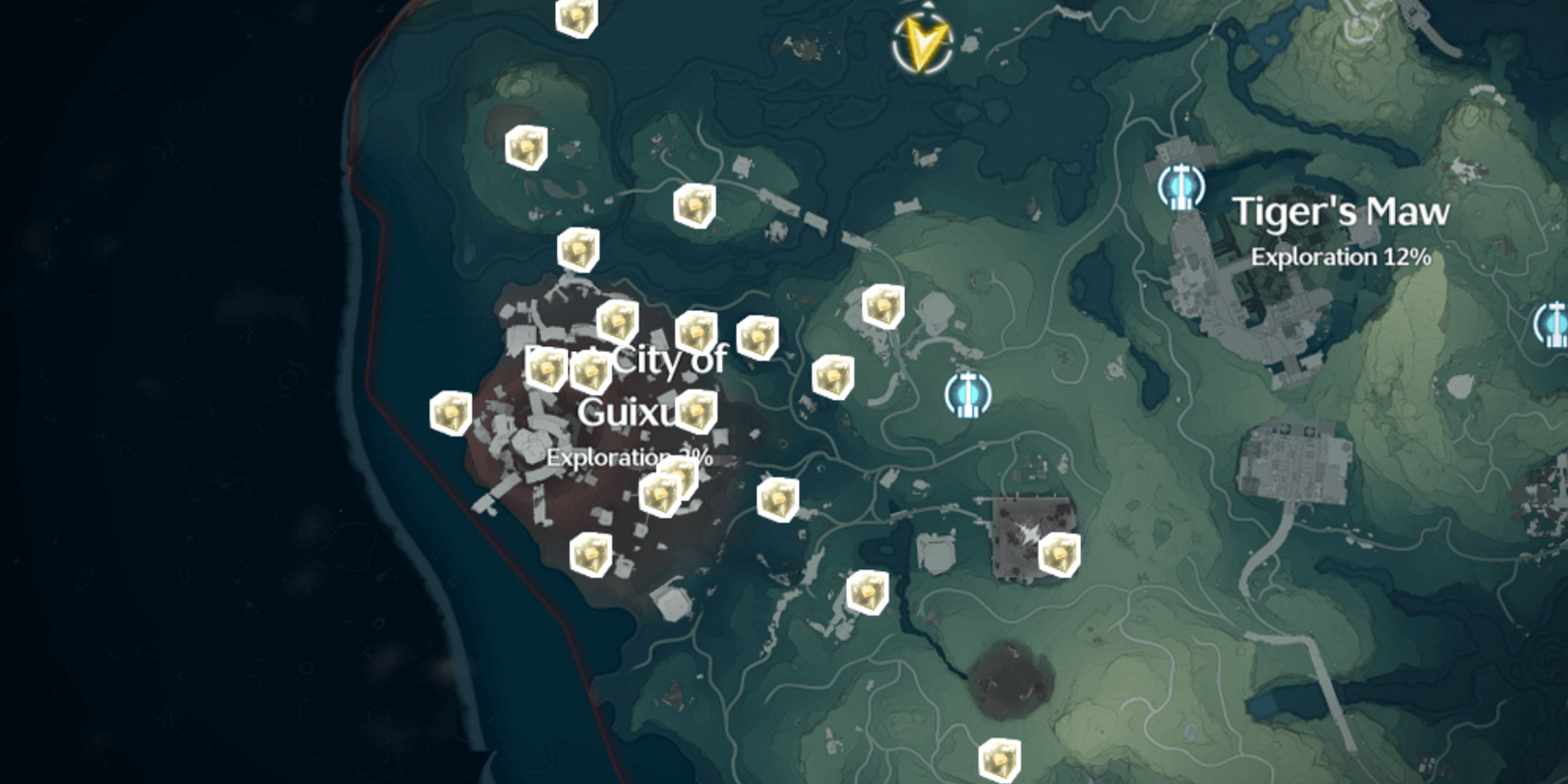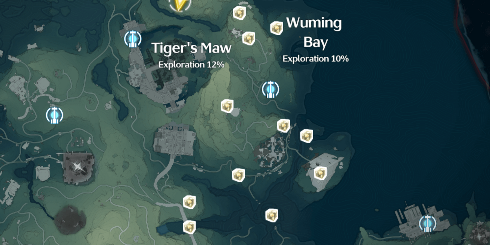 Directamente al este de Tiger’s Maw, encontrarás Wuming Bay. Coge los once ataúdes de Sonance en el área, la mayoría de los cuales están en el al sur de la Baliza de Resonancia del área. También hay un mirador y un Blobfly en esta región, así que si los estás buscando, puedes encontrarlos aquí. Una vez que hayas terminado aquí, dirígete a la ciudad portuaria de Guixu, al oeste.