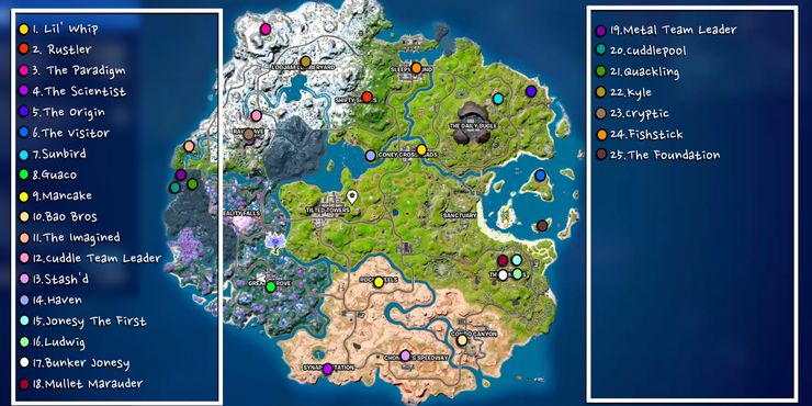 A continuación se muestra una lista de lugares donde cada NPC en Fortnite Capítulo 3 Temporada 3 puede ser encontrado: