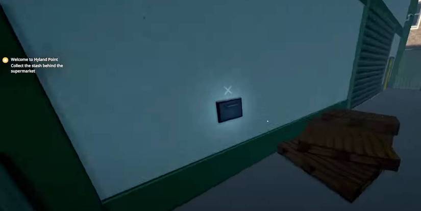 Este alijo es fácil de perder, ya que podría caminar fácilmente más allá del supermercado y perder la noción de él mientras llega a otros edificios de Hyland Point. Como una buena regla general, me aseguré de cruzar la calle desde el canario carmesíotro edificio al lado del supermercado. El callejón trasero del supermercado está directamente frente a este lugar, con el alijo muy visible de él también.