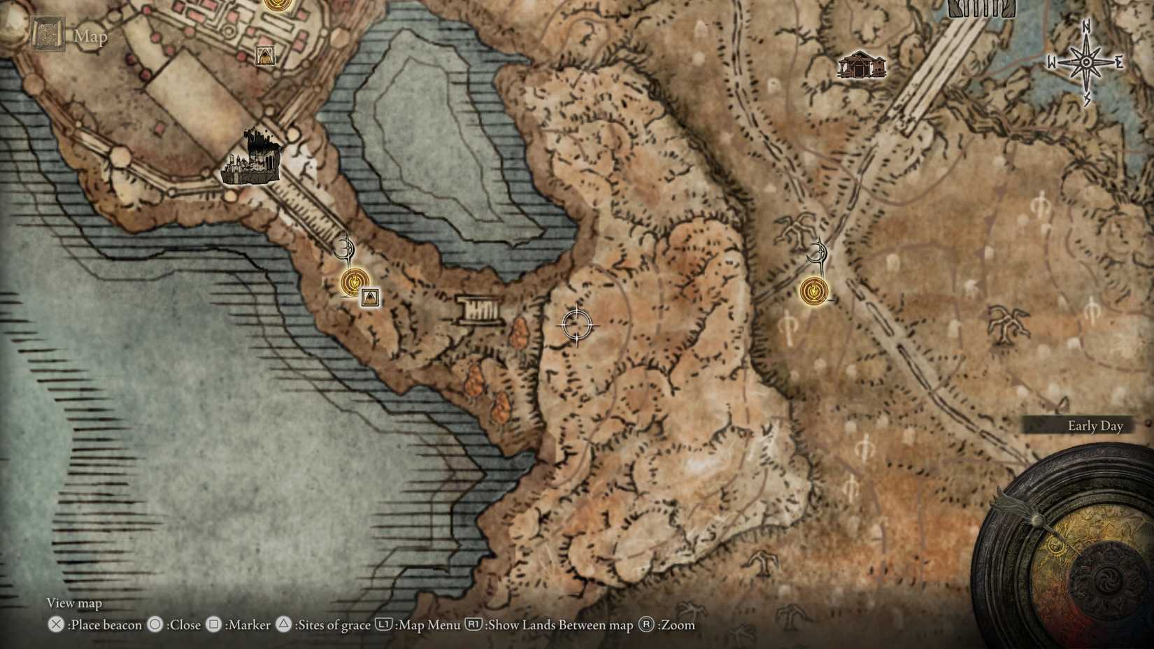 |   | Fortaleza de las Sombras, Scadu Altus – A la derecha de la estatua sin cabeza de la Reina Marika, hay un balcón con un cadáver al que sólo se puede llegar después de bajar el nivel del agua. |