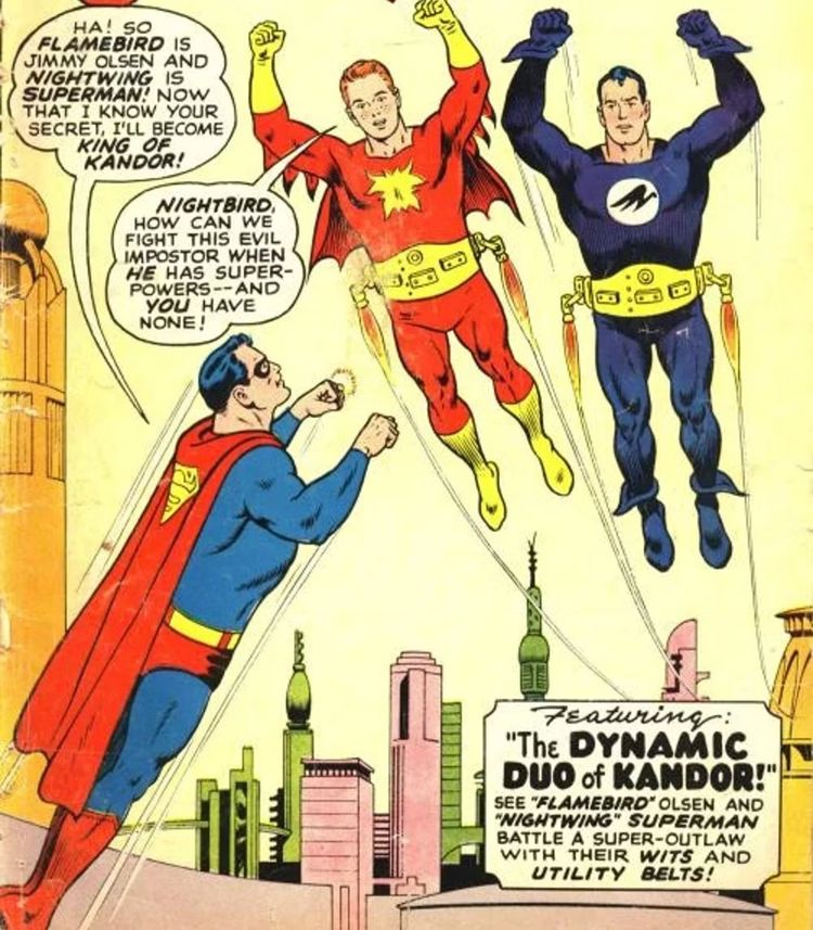 Superman, por supuesto, no es el kryptoniano promedio. La era anterior a la crisis de DC presenta por primera vez la ciudad botella de Kandor, con Superman decidido a descubrir cómo cambiar su tamaño. Sin embargo, una vez que los habitantes se vuelven contra uno de los héroes más fuertes de DC en favor de un científico que afirma saber cómo cambiar el tamaño de Kandor, Superman busca la ayuda de Jimmy Olsen para investigar el asunto. Juntos adoptan los disfraces de superhéroes de Nightwing y Flamebird, con sus nombres inspirados en pájaros kryptonianos. Cuando sus esfuerzos terminan, pasan sus mantos a Van-Zee y Ak-var para continuar con su legado como héroes de Kandor.