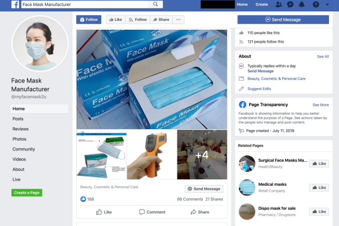 TechCrunch llevó a cabo nuestras propias búsquedas en Facebook hoy y, aunque algunos términos de búsqueda obvios no arrojaron resultados, modificamos un poco las opciones de palabras clave y rápidamente pudimos encontrar páginas adicionales que buscaban máscaras faciales, como el ejemplo siguiente tomado de una página de Facebook que se hace llamar ‘Cara’ Fabricante de mascarillas ‘.