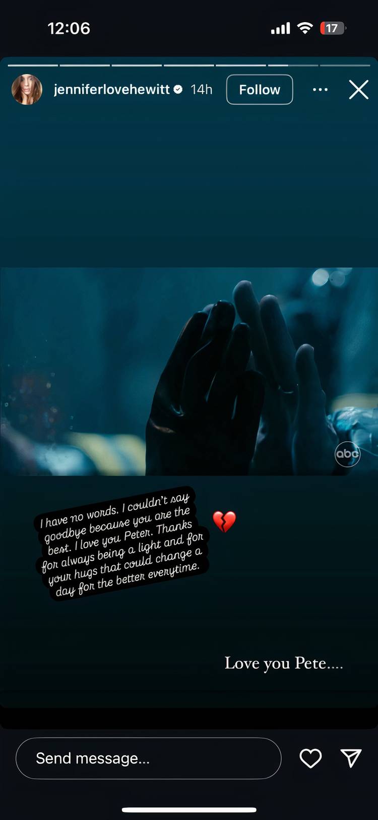 Jennifer Love Hewitt compartió una quiebra de las manos de Bobby y Athena tocando a ambos lados del vaso, con la leyenda: “No tengo palabras. No podía decir adiós porque eres el mejor. Te amo Peter. Gracias por ser siempre una luz y por tus abrazos que podrían cambiar un día para mejor cada vez.“