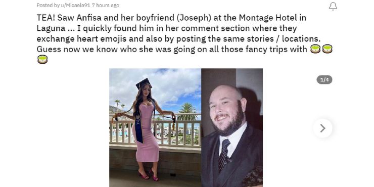 Pero parece que Anfisa tiene un nuevo hombre diferente en su vida ahora, que el usuario de Reddit u/Micaela91 cree que se llama Joseph. Anfisa, residente de San Diego, se graduó recientemente de su programa en la Escuela de Negocios UC Irvine Paul Merage con gran éxito. Desde entonces ha estado publicando sobre sus celebraciones en Instagram. Si bien el Redditor no respaldó sus afirmaciones con fotos, escribieron que vieron “Anfisa y su novio (Joseph) en el Hotel Montage en Laguna.” La fan corrió rápidamente al perfil de Anfisa y descubrió a Joseph en su sección de comentarios.