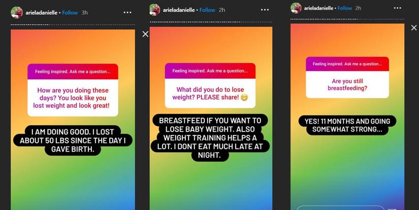 Ariela había revelado lo que la ayudó a perder la mayor parte de su peso durante una sesión de preguntas y respuestas con sus seguidores de Instagram. El fan le había dicho a Ariela que se veía genial después de perder peso. Ariela reveló que había perdido más de 50 libras desde el día en que dio a luz. Cuando alguien más le pidió a Ariela que revelara lo que hizo, ella respondió: “Amamante si desea perder peso.Ariela también explicó que el entrenamiento con pesas había sido de gran ayuda en su caso. Dijo que “ayuda mucho” y agregó que evita comer muy tarde en la noche.
