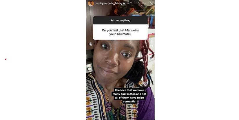 La respuesta de Ashley al fan hace que parezca que no cree que Manuel sea su “alma gemela,” lo que significa que ella realmente no se siente profundamente conectada con él a nivel del alma. La mayoría de los problemas de relación de Ashley y Manuel se deben de él guardándole secretos o manteniéndola en secreto de su familia. Manuel no le había contado a su familia que había ido a Estados Unidos para casarse con Ashley cuando llegó a Nueva York con una visa K-1. Existe la posibilidad de que los hijos adolescentes de Manuel ni siquiera sepan de la existencia de Ashley, ya que ella ni siquiera los ha conocido.