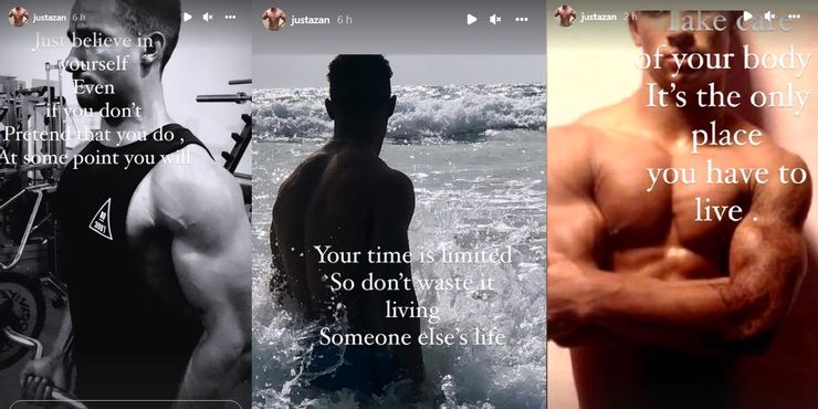 Su tercera historia de Instagram fue subtitulada, “Cuida tu cuerpo Es el único lugar que tienes para vivir,” para lo cual usó una foto frontal completa sin camisa de sí mismo. Los fanáticos a menudo atrapan a Azan compartiendo fotos similares de ejercicios e imágenes de su café diario y libros favoritos en Instagram. Pero a menudo, también sospechan que en realidad es Nicole usando el Instagram de Azan en lugar de él y También se demostró que tenían razón en una ocasión. En noviembre de 2020, cuando los espectadores ya estaban seguros de que Nicole y él habían terminado, Azan había publicado una selfie con Nicole en su IG después de tres años, que desde entonces ha sido eliminada.