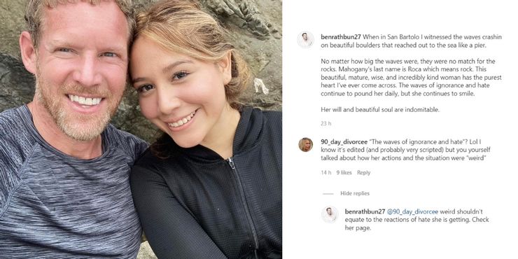 Los fanáticos ciertamente no han quedado impresionados por la lista de mentiras de Mahogany en prometido de 90 días, lo que ha llevado a que algunos de ellos la asen en sus comentarios de Instagram. Esta crítica ha dejado a Ben notablemente furioso cuando hizo una nueva publicación de Instagram al respecto. Ben compartió lo que parece una selfie reciente con su novia y escribió que Mahogany, cuyo apellido “Roca” significa roca, es un “mujer hermosa, madura, sabia e increíblemente amable” con el corazón más puro. “Las olas de ignorancia y odio continúan azotándola a diario, pero sigue sonriendo. Su voluntad y su bella alma son indomables.”, agregó Ben. A prometido de 90 días espectador publicó un comentario que decía: “’¿Las olas de ignorancia y odio? Lol, sé que está editado (y probablemente con mucho guión), pero tú mismo hablaste sobre cómo sus acciones y la situación eran “raras”.”