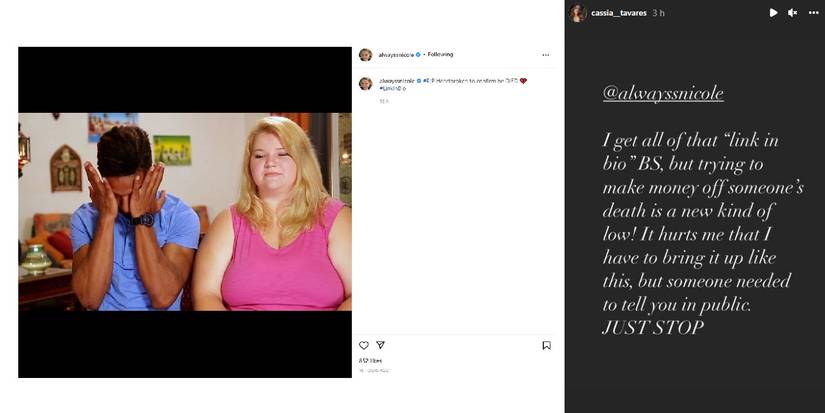 La exesposa de Jason, Cassia, etiquetó directamente a Nicole en su historia y la criticó por intentar ganar dinero con la muerte de Jason. Cassia admitió que “duele” Ella tenía que plantear el tema de esa manera. “Pero alguien necesitaba decírtelo en público,” le dijo a Nicole. “Simplemente detente”, agregó Cassia, enojada. Nicole no le respondió a Cassia. Las palabras de Cassia no afectaron a Nicole. Ella continuó publicando mensajes peligrosos similares incluso hoy.