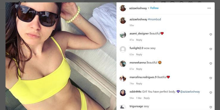 En 2020, Aziza publicó esta foto durante la cuarentena y la subtituló: “#mombodLos fans le enviaron cientos de comentarios halagando su figura, que lució en un bikini amarillo brillante. Muchos 90 días Los miembros del elenco han alardeado de su pérdida de peso a través de cirugías estéticas y comenzaron a promocionar productos para perder peso. Sin embargo, Aziza parece haberse mantenido en forma a la antigua usanza, a través de la dieta y el ejercicio.