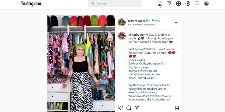En uno de los looks más coloridos de Erika, con cabello arcoíris y una remera a juego, presumió su estilizada figura. 90 días los fanáticos felicitaron su llamativo aspecto y cabello. A los fanáticos siempre les encanta cómo se mantiene fiel a sí misma y no se conforma vistiéndose convencionalmente. Si bien a Erika le encanta la moda, pone más énfasis en celebrar su cuerpo con ropa, en lugar de centrarse en la pérdida de peso.