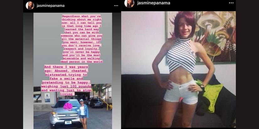 Jasmine dijo que a pesar de las dificultades, estaba tratando de fingir una sonrisa y fingir que estaba feliz. Jasmine tenía el pelo rojo en la foto mientras estaba de pie con las manos en las caderas, vistiendo un par de diminutos pantalones cortos blancos con un top de rayas. Jasmine reveló Ella solía pesar sólo 100 libras. Ella escribió que había aprendido el “de manera difícil“que ella podía estar con alguien que le diera todas las cosas materiales que ella quería, pero nunca era feliz porque no recibía lealtad y respeto.