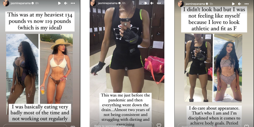 Jasmine ganó alrededor de 15 libras después de filmar Antes de los 90 días Temporada 5. En enero de 2023, Jasmine compartió fotos de antes y después de perder peso. Reveló que llegó a pesar 134 libras y actualmente pesa 119 libras. Jasmine ahora está en su peso ideal. Aumentó de peso cuando comía “muy mal” la mayor parte del tiempo y no hacía ejercicio con regularidad. Jasmine dijo que no fue constante durante la pandemia y tuvo dificultades para hacer dieta y ejercicio. No sentirse ella misma porque le gustaba mirar “Atlético y en forma.“