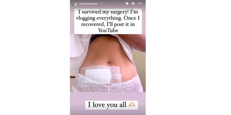 Esta semana, Jasmine sorprendió a sus fans de Instagram al publicar una foto de su estómago. En la imagen, Jasmine se levantó la camisa para revelar un vendaje en la parte inferior derecha de su abdomen. “¡Sobreviví a mi cirugía!—confesó Jazmín. Explicó que está vlogueando todo lo que le ha estado pasando. Sin embargo, Jasmine no reveló exactamente para qué era la operación. Jasmine aseguró a sus más de 130.000 seguidores de Instagram que una vez que se recupere, responderá todas sus preguntas. Ella va a hacer un video para compartir en YouTube. Jasmine, habitante de Panamá, agregó: “Los amo a todos,” en su historia de Instagram para sus admiradores. Luego compartió una foto de primer plano de su vendaje para heridas.