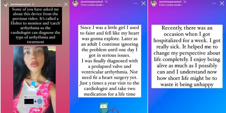 En una de sus publicaciones de video, Jasmine usaba un dispositivo llamado monitor Holter que preocupaba prometido de 90 días los espectadores preguntan sobre su salud. Jasmine explicó que el dispositivo se usa para “atrapar” arritmia para que su cardiólogo pueda diagnosticar los ritmos de su corazón y, en consecuencia, proporcionar tratamiento para su ritmo cardíaco irregular. “Desde niña me desmayaba y sentía que mi corazón iba a explotar”, confesó Jazmín. La creadora de contenido para adultos, Jasmine, siguió ignorando el problema hasta que un día, como adulta, “se metió en problemas serios.” Jasmine dice que finalmente le diagnosticaron una válvula prolapsada y arritmia ventricular.
