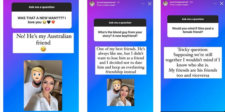 Mientras Gino dijo que era de hace seis años, Jasmine gritó: “sigues mintiendo sobre lo simple [things]!Gino, que suele estar tranquilo durante las peleas, salió furioso después de voltear una silla y le dijo a las cámaras:He terminadoEs por eso que cuando Jasmine publicó una foto con un extraño, los fanáticos asumieron que se había separado de Gino y estaba saliendo con un nuevo novio. Aunque Jasmine publicó un emoji sobre la cara del hombre, subtituló la foto con “la amistad dura para siempre.Además, Jasmine estaba toda glamorosa para la reunión con una nueva transformación de maquillaje y cabello, vestida con un impresionante atuendo completamente blanco. Los seguidores de Instagram de Jasmine tuvieron la oportunidad de preguntarle sobre el hombre rubio durante una sesión de preguntas y respuestas que organizó más tarde.Que eso un hombre nuevo???“fue una de las preguntas a las que Jasmine respondió con, “¡No! el es mi amigo australiano.”