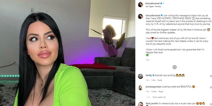 Pero la última publicación en el Instagram de Larissa está lejos de ser una broma, ya que escribió: “Estoy escribiendo este mensaje para compartir con todos ustedes que tengo MUY EMOCIONADAS ‘NOTICIAS DE PRIMERA MANO’‘” Según Larissa hay “algo masivo” que ella y su equipo están en proceso de lanzar. Esta nueva actualización se aplica no solo a la “VIP” de su sitio web sino también a “alguien” que realmente ama el viaje de Larissa. Larissa afirmó: “¡Este será el capítulo más grande de mi vida aquí en Estados Unidos hasta ahora!Y le pidió a sus más de 727k seguidores de Instagram que se mantuvieran atentos para más actualizaciones.
