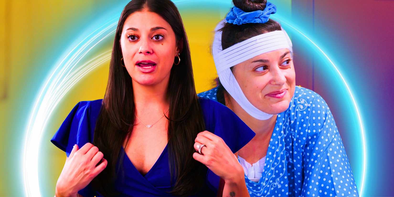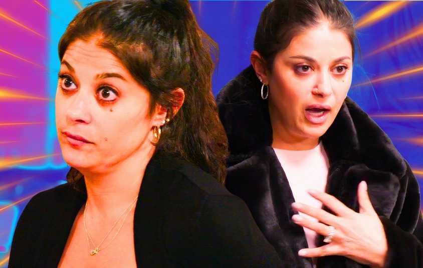 90 day fiance star loren brovarnik in two black outfits looking angry with blue background