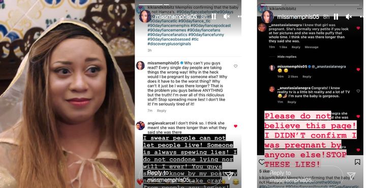 Parece que una página de fans de Instagram localizó ciertos comentarios en la foto ahora eliminada del bebé de Memphis y los compartió con la leyenda: “Memphis confirma que el bebé no es de Hamza.” Dicha publicación también se eliminó ahora, pero Memphis tomó capturas de pantalla de la publicación y un comentario que dejó en ella donde los llamó por mentir y confirmó que Hamza es, de hecho, el padre biológico de su bebé. “¡Por favor, no creas en esta página! ¡NO confirmé que estaba embarazada de nadie más! DETÉN ESTAS MENTIRAS,”, escribió Memphis en su propia historia de Instagram después de compartir una captura de pantalla de la publicación de la página de fans.