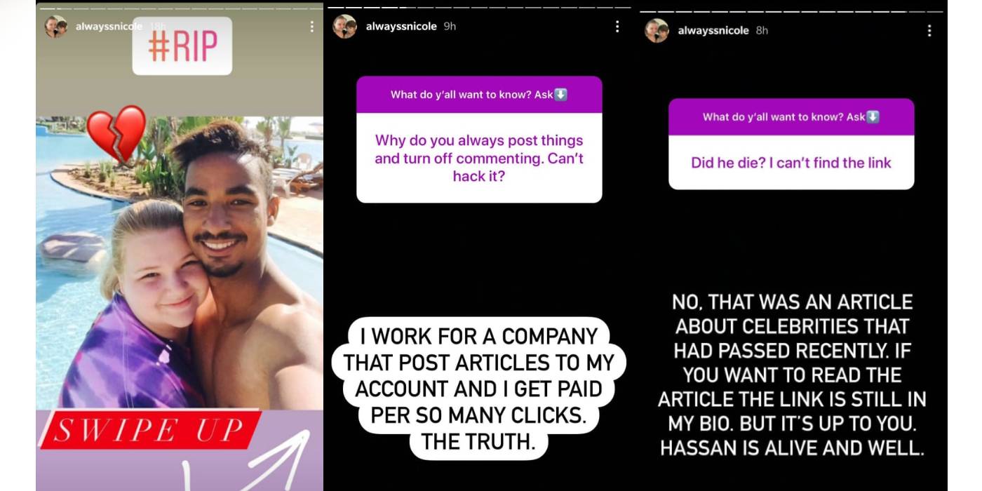 Nicole había vinculado un artículo que hablaba sobre su separación y Azan. Nicole finalmente abordó estos enlaces fraudulentos que estaba publicando cuando era enfrentado por ex Prometido de 90 días estrella Cassia Tavares. Nicole había publicado una foto de ella y Azan con la leyenda: “#RIP con el corazón roto para confirmar que MURIÓ” y el artículo vinculado a la publicación trataba sobre la muerte de Jason Hitch en diciembre de 2021. Cassia acusó a Nicole de intentar ganar dinero con la muerte de alguien y añadió Nicole había alcanzado un nuevo nivel bajo.