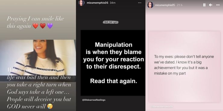 Este fue el comienzo de que Memphis compartió varias historias de Instagram pasivo-agresivas más, en forma de citas y subtítulos que aluden a una separación entre ella y Hamza. Ha escrito sobre el karma golpeando a la gente mala. “La manipulación es cuando te culpan por tu reacción a su falta de respeto.”, decía una de las citas que ha compartido Memphis la semana pasada. Una historia diferente en la página de Memphis era una en la que le pedía a sus ex que no le dijeran a nadie con quién habían salido. “Sé que es un gran logro para ti, pero fue un error de mi parte.”, decía el resto de la publicación. Una historia de Instagram diferente compartida por B90Menfis declaró: “finalmente me di cuenta de que nunca estaba pidiendo demasiado, solo estaba pidiendo a la persona equivocada.