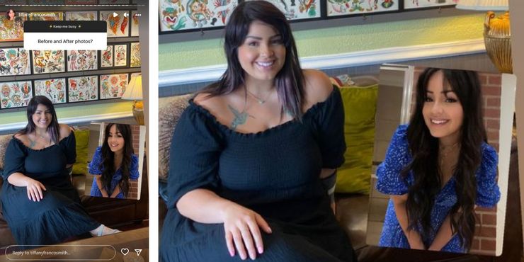 En su foto de antes, Tiffany estaba sentada en lo que parece ser el estudio de un tatuador vestida con un vestido azul oscuro. Prometido de 90 días La celebridad Tiffany usó los hombros fruncidos de su hermoso vestido con su estilo característico y mostró una amplia y brillante sonrisa para la cámara. En su foto posterior, Tiffany luce casi irreconocible con largas extensiones de cabello y un vestido estampado. Tiffany parecía pesar la mitad de su peso en la foto cuando se inclinó para tomarse una selfie, pero lo que se mantuvo constante en ambas fotos fue su sonrisa contagiosa.