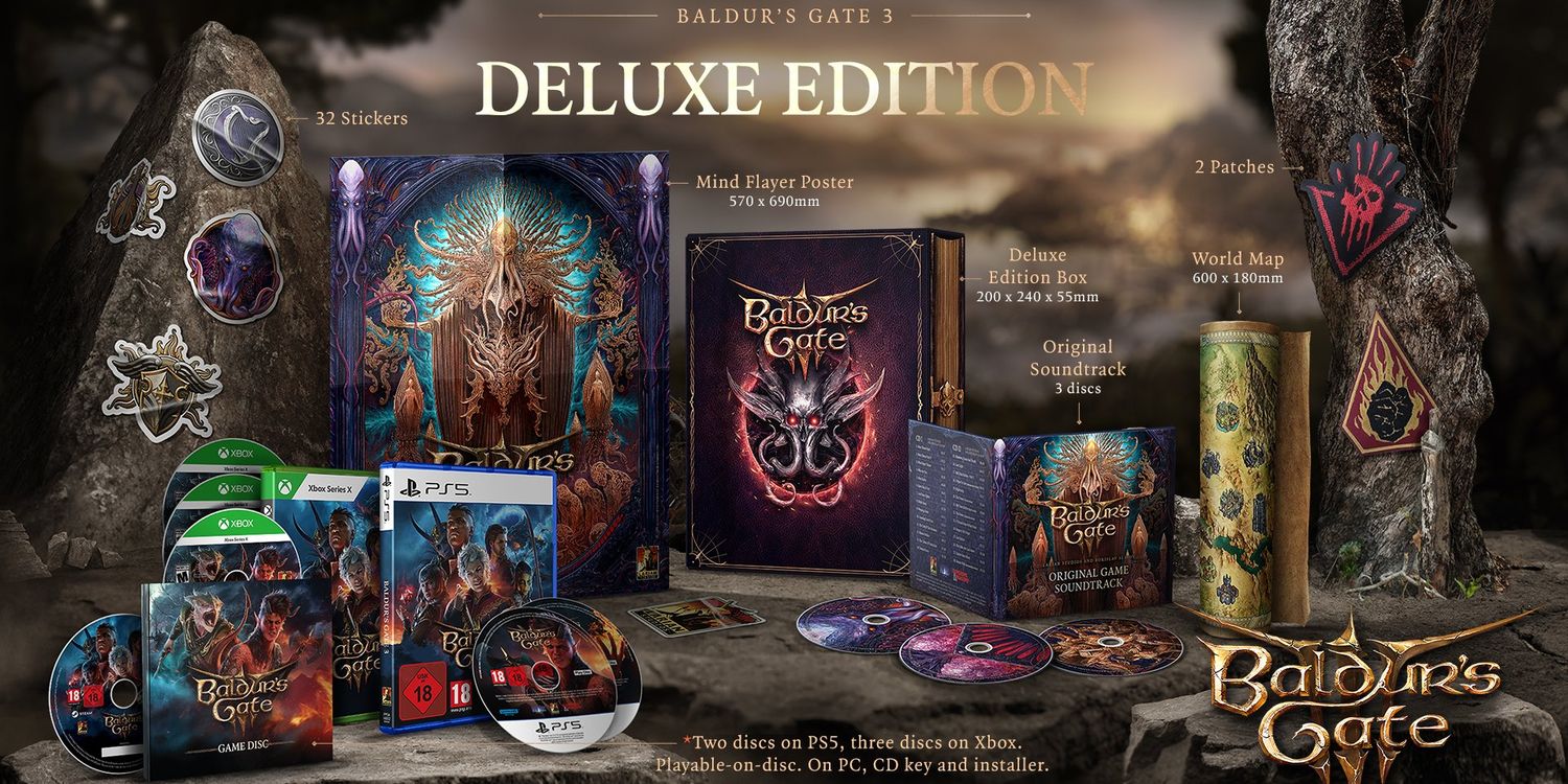 “/> La Edición Deluxe viene con ventajas especiales en comparación con la simple compra digital. El primero y más obvio es un copia fisica del juego, dependiendo de la versión que se compró. La versión de PlayStation 5 viene con dos discos, mientras que la versión de Xbox de Puerta de Baldur 3 Tiene tres discos. La versión para PC del juego tiene una clave de serie de Steam y un disco con un instalador. Todas las versiones de la Edición Deluxe vienen con una versión física de la banda sonora original del juego, compuesta por tres CD, así como un mapa de doble cara hecho de Wilbalin Buckram, un material de encuadernación de alta calidad con una textura similar a la de una tela.