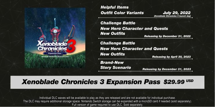 Me gusta Xenoblade crónicas 2 antes de eso, Xenoblade crónicas 3 tiene un Pase de Expansión. El DLC solo se puede adquirir a través del Pase de expansión y no se venderá por separado. No parece como si el Xenoblade crónicas 3 El Expansion Pass será parte del DLC ofrecido en el Expansion Pack de Nintendo Switch Online, aunque eso podría cambiar en el futuro. El contenido del Pase de expansión se lanzará en oleadas, y el primero llegará el día del lanzamiento, ofreciendo elementos y variantes de color para los atuendos. La segunda ola se lanzará a fines de 2022 y la tercera ola se lanzará el 30 de abril de 2023, y ambas ofrecen batallas de desafío, nuevos personajes héroes, nuevas misiones y nuevos atuendos. La ola final se lanzará el 31 de diciembre de 2023 y ofrecerá un nuevo escenario de historia, posiblemente uno grande si el Xenoblade crónicas 2 DLC es cualquier cosa para continuar.