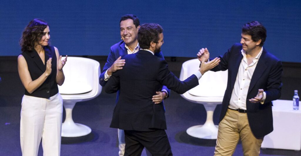 Como Ayuso lo opacó todo, desde su entrada con categoría de “¡presidenta, presidenta!” para las bases, hasta decenas de focos mediáticos, la gran conversación preparada entre seis mandatarios autonómicos para presumir de “los gobiernos de la libertad” quedó bastante deslucida. Algunos de los llamados barones moderados, eternos aspirantes a subir otro escalón dentro de la escala de poder del PP futuro cuando a Casado se le acaben las balas electorales, se vieron forzados a estirar e improvisar discursos para una candidatura no se sabe muy bien a qué. El que más lo intentó fue el presidente gallego, Alberto Núñez Feijóo, canciller de las bondades del bipartidismo, que comenzó con algo más que una advertencia: “Llegar a gobernar no se regala”. Y conminó a todos los presentes a regresar a casa el lunes, tras la clausura este domingo de la convención por Casado, “enchufados de ilusión” pero dispuestos a trabajar.