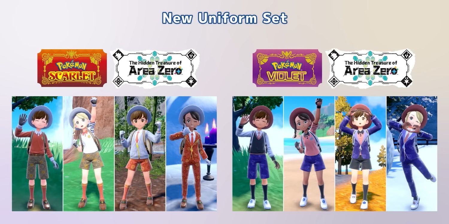 El conjunto de uniforme nuevo es uno de los dos bonos de pre-pedido actualmente disponibles para El tesoro escondido del área cero DLC. Este conjunto de ropa proporciona a los jugadores cuatro uniformes escolares nuevos, uno para cada temporada, junto con un sombrero y una bolsa nuevos. Al igual que con los juegos base, la apariencia de los nuevos atuendos difiere según la versión del juego. Pokémon EscarlataLa Academia Naranja utiliza un uniforme predominantemente naranja, mientras que Pokémon PúrpuraLa Academia Uva de ‘s usa púrpura. Estos colores combinan con los emblemas de frutas de las academias, naranjas y uvas respectivamente, y las frutas también se pueden ver en los patrones de los nuevos uniformes como diseños estilizados.
