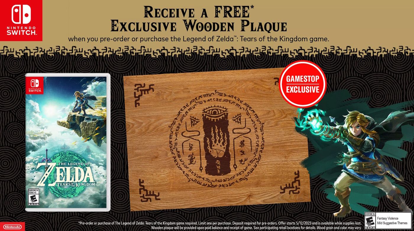 Uno de los pocos que quedan Lágrimas del Reino Los bonos de pre-pedido para jugadores en los EE. UU. son una placa de madera exclusiva de GameStop. Esta placa solo se ofrece para la copia física del título y estará disponible en el momento de la recogida en la tienda local. GameStop recomienda que las personas llamen a sus ubicaciones para asegurarse de que las placas estén disponibles antes de ir a recogerlas, sin embargo, ya que los suministros serán limitados.