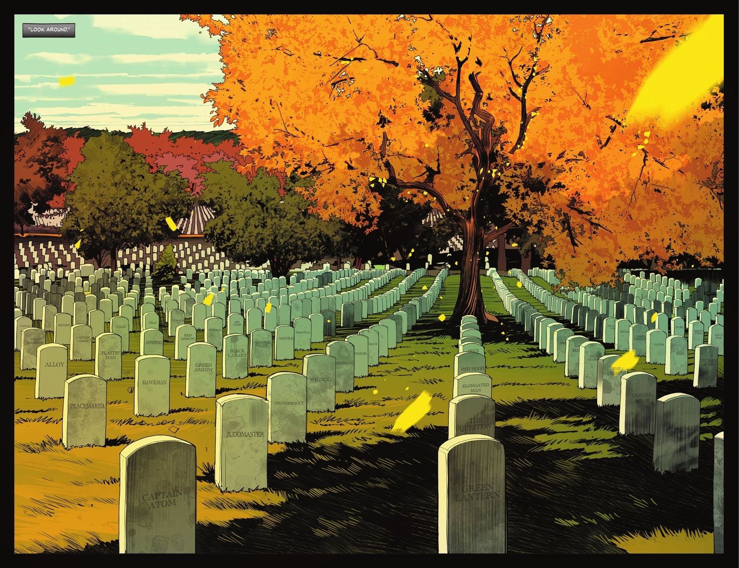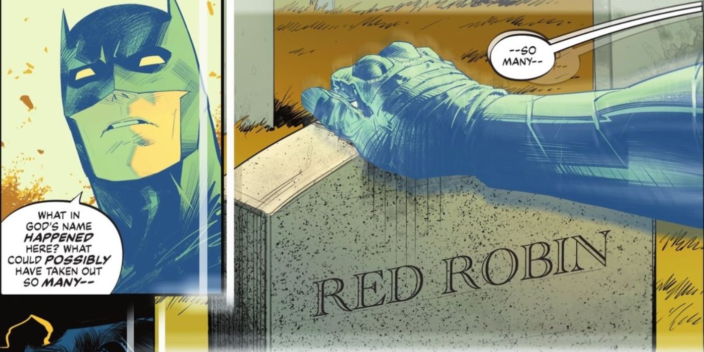 Al leer algunas lápidas seleccionadas que son visibles en esta extensión de doble página, se muestra que Atom Smasher, Plastic Man, Red Arrow, Peacemaker, Green Arrow, Black Canary, Hawkman, Kid Flash, Starman, Doctor Fate, Wildcat, Green Lantern, Se confirma que The Question, Batwoman, Zatanna, Donna Troy, Red Hood, Elongated Man, Obsidian y Jace Fox están muertos, y aún más pueblan los terrenos sagrados de esta tumba masiva de superhéroes. Y si bien es cierto que algunas de estas revelaciones son personajes que los fanáticos ya han visto morir en el panel, la mayoría son pesos pesados cuyas muertes aún no se han hecho oficiales, siendo Red Robin (Dick Grayson en esta continuidad) uno de los más importantes que incluso Batman, que viaja por la realidad, no puede creerlo.