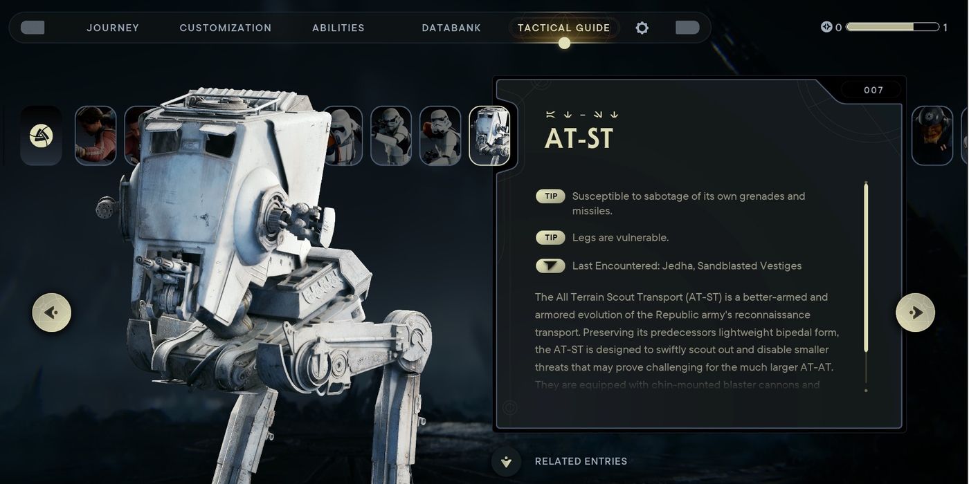 El AT-ST es una vista divertida para muchos Guerra de las Galaxias fanáticos, y al principio, puede parecer bastante desafiante en la batalla. Siguiendo el ejemplo establecido en las películas, el All Terrain Scout Transport es vulnerable en sus piernas con su diseño muy defectuoso. El AT-ST arroja muchas granadas y misiles que los jugadores también pueden usar para su beneficio si son lo suficientemente astutos con los poderes de la fuerza de Cal en Comer: sobreviviente.