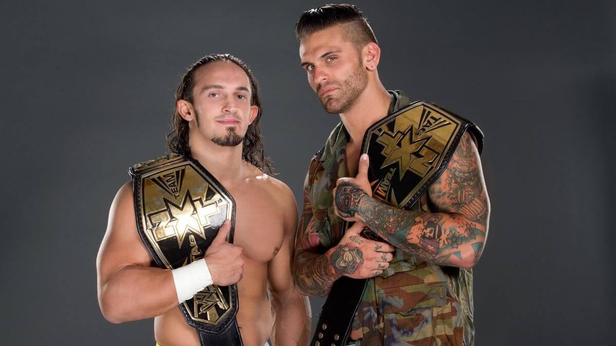 Adrian Neville (izquierda) y Corey Graves (derecha) como NXT Tag Team Champions – Copyright. Entretenimiento mundial de Lucha Libre