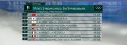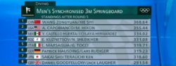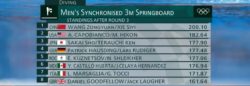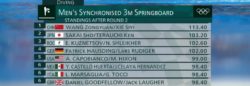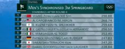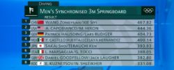 Tras fallar la mancuerna rusa de Evgenii Kuznetsov y Nikiga Shleikher su ejecución, calificado con cero puntos, el último obstáculo al podio para los mexicanos fueron los alemanes Hausding y Rudiger, quienes resistieron la presión y con una calificación de 85.50, superaron por sólo cuatro puntos a Castillo y Celaya, para quedarse con el bronce.