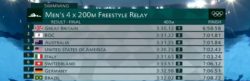 En la última final de la jornada, pero no la menos espectacular, el equipo de la Gran Bretaña se quedó a sólo tres centésimas de segundos de imponer un récord mundial en el relevo 4X200 metros libres.