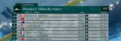 La canadiense Margaret Macneil conquistó la medalla de oro en los 100 metros mariposa femenil con tiempo de 55.59 segundos, relegando al segundo lugar a la china Yufei Zhang (55.64), completó el podio la australiana Emma McKeon (55.72).