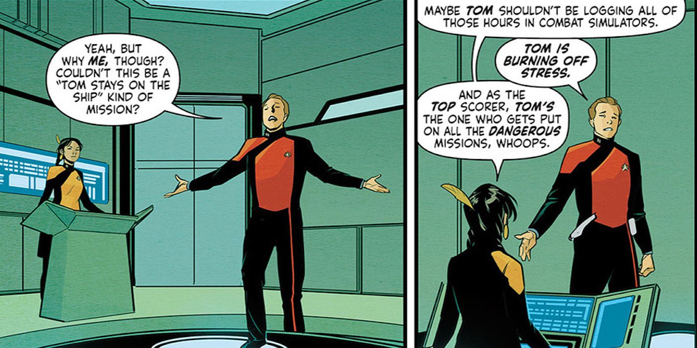 - En Star Trek #13, los lectores aprenden que Tom es elegido para misiones peligrosas debido a su impresionante desempeño en el simulador de combate.