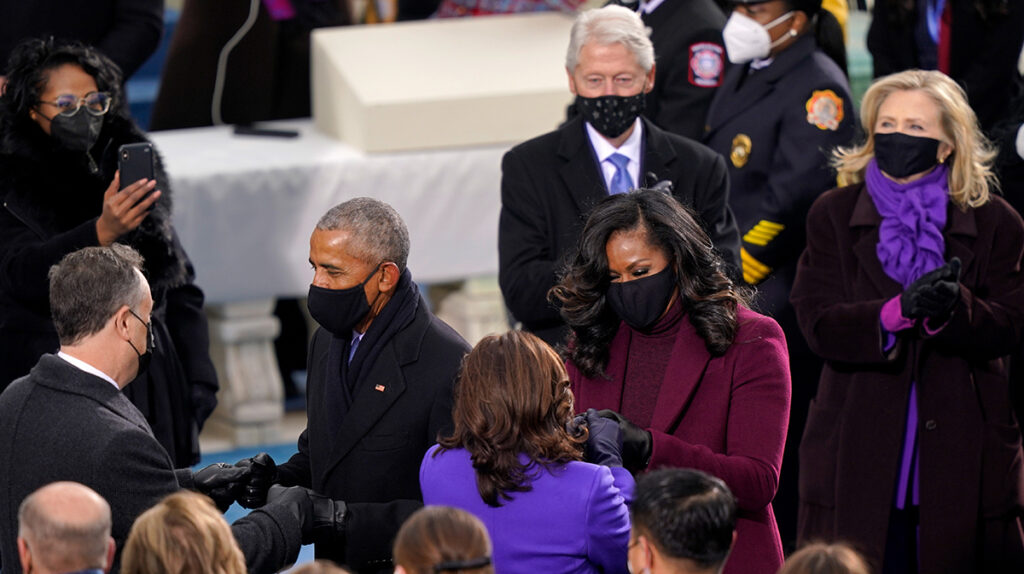 Pero la coordinación en atuendos no fue una coincidencia imprevista. Numerosos invitados optaron por vestir de tonos de púrpura incluyendo a la misma Harris, la exprimera dama Michelle Obama y la candidata presidencial demócrata en 2016, Hillary Clinton.