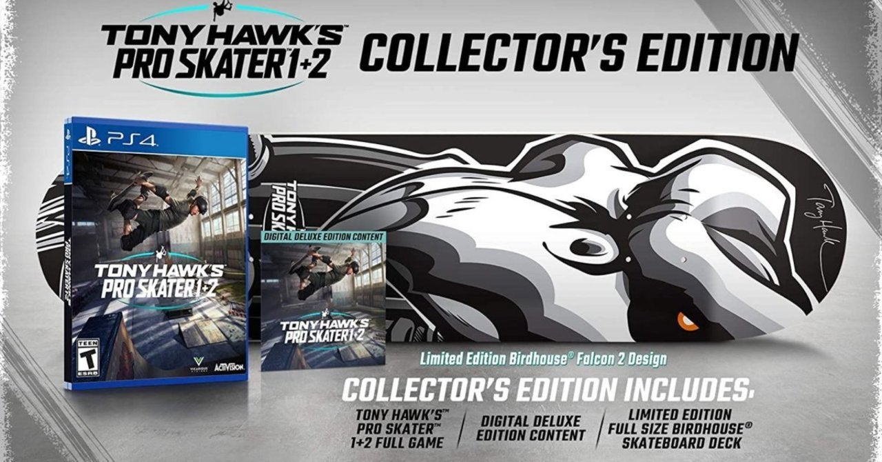 El Tony Hawk’s Pro Skater 1 y 2 Collector’s Edition viene con el juego para PS4 o Xbox One, todo el contenido de la Edición Deluxe (el skater ‘The Ripper’ de Powell-Peralta, trajes únicos retro de los años 80 para Tony Hawk, Steve Caballero y Rodney Mullen y un contenido retro único para el modo Create-A-Skater), y una cubierta de skateboard Birdhouse de edición limitada de tamaño completo que es una reedición del icónico diseño Falcon 2. La baraja también presenta un autógrafo Tony Hawk impreso y manchas de madera al azar en la parte superior. Todo esto tiene un precio bastante razonable de $ 99.99.