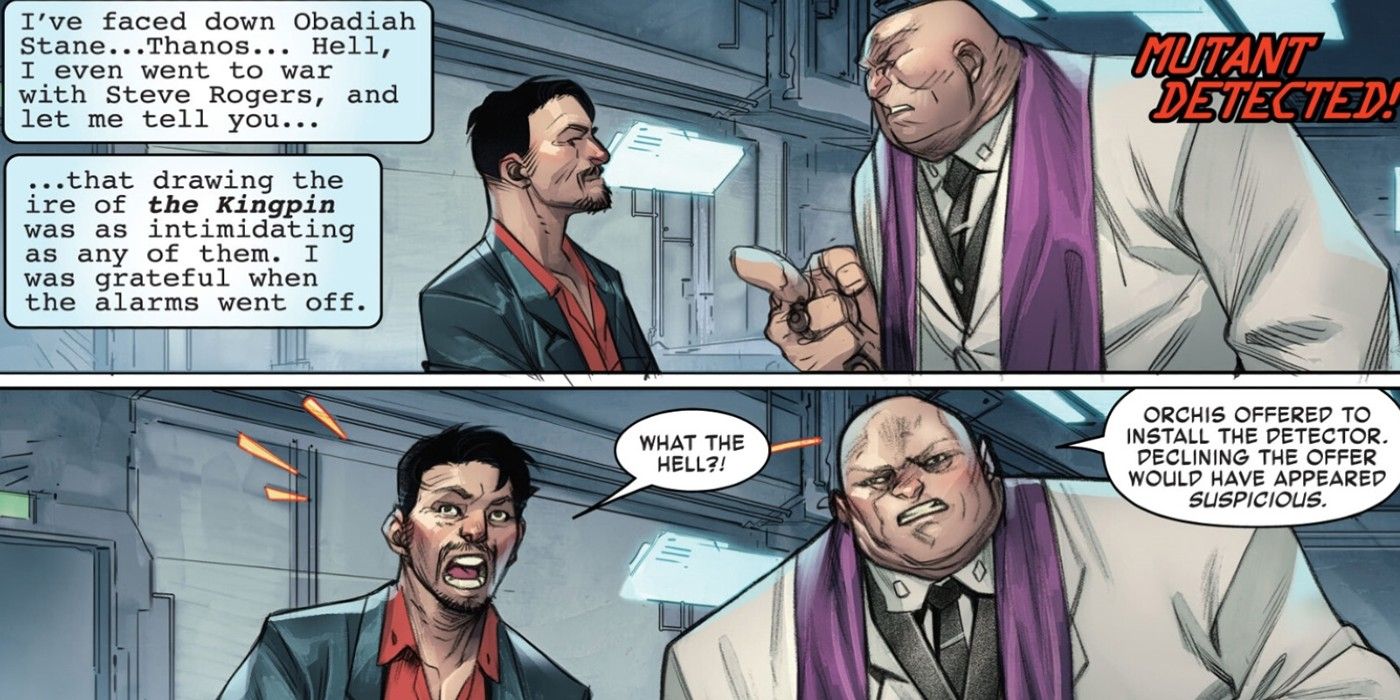 “/> La guerra crea compañeros de cama extraños, y Kingpin y Iron Man trabajando juntos es una prueba. Tanto Fisk como Iron Man se han convertido en aliados de los mutantes a raíz del ataque de Orchis en la Hellfire Gala de este año. Este horrible evento terminó con numerosos mutantes exiliados de la Tierra y muchos más asesinados o detenidos. Iron Man y Kingpin se han unido a una nueva encarnación del Hellfire Club, y si bien pueden tener un enemigo común, los dos todavía están en lados opuestos de la ley. Como se ve en este número, Iron Man tiene legítimamente miedo de Kingpin.