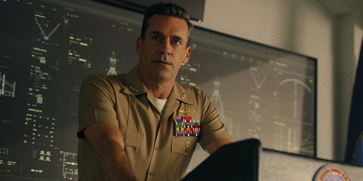 Jon Hamm se une a la arma superior universo en la secuela con el papel del vicealmirante Beau “Cyclone” Simpson, el comandante de las Fuerzas Aéreas Navales. Cyclone, un burócrata militar de rostro severo, solo recluta a Maverick a instancias de Iceman, y no cree que le quede nada que ofrecer a la Marina.