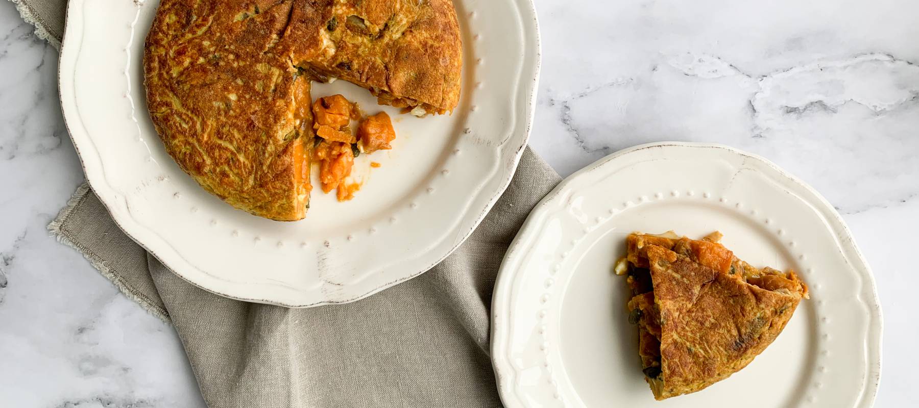 Aquí vienen dos recetas en una: una guarnición deliciosa de boniato al horno con bien de especias y aderezado con queso feta cuyos restos hemos convertido en una rica tortilla. Si ya tenemos a España dividida entre los concebollistas y los sincebollistas, no me quiero imaginar si ahora abrimos el melón de conpatatistas o conboniatistas. En lugar de tener que elegir, ¿Por qué no quedarnos con las dos?