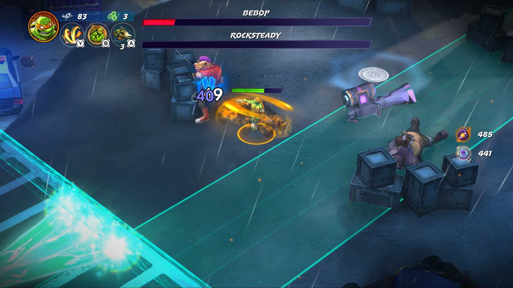 TMNT: Destino astilladoEl combate es inmediatamente limpio y legible.apegándose a los conceptos básicos de esquivar/atacar del género, confiable pero sencillo. Cada Tortuga está equipada con un ataque de habilidad recargable y una herramienta de arma, siendo la última intercambiable y la primera fijada al personaje. Hay shuriken elementales, bolas de fuego, guiones mágicos, botes de exudado explosivos y muchos más, todos los cuales llenan la pantalla con varios colores y efectos.